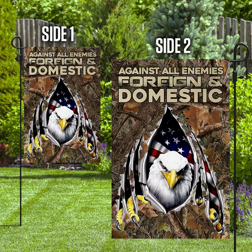 All flags are manufactured to American quality standards and custom-made to order. You will never be disappointed by the Against All Enemies Foreign And Domestic. Eagle Patriotism Flag.