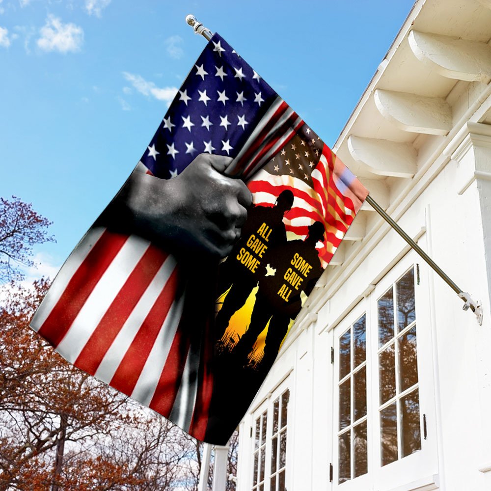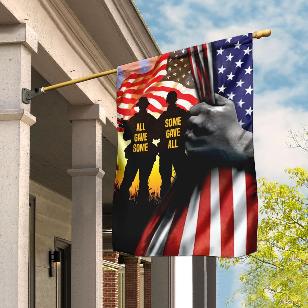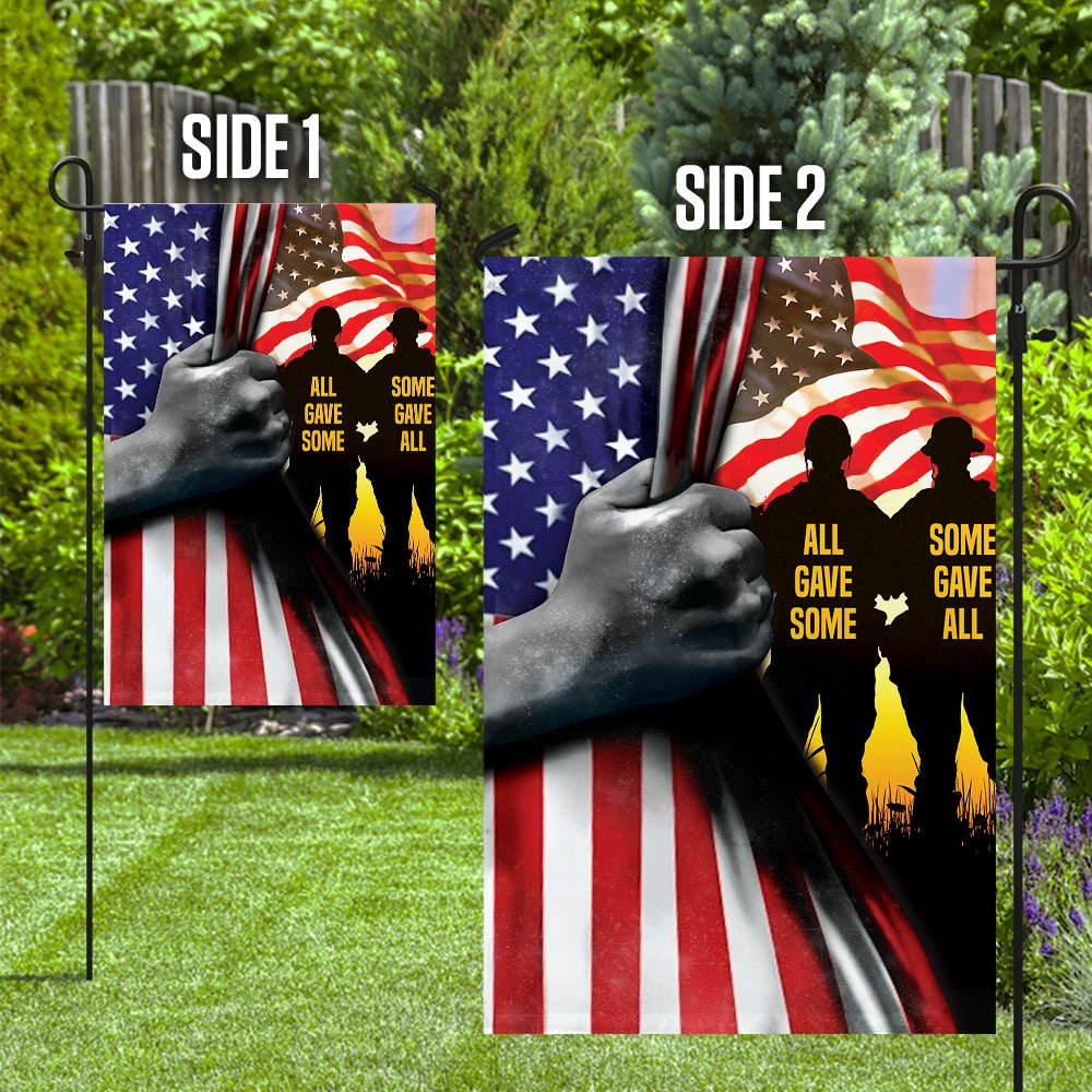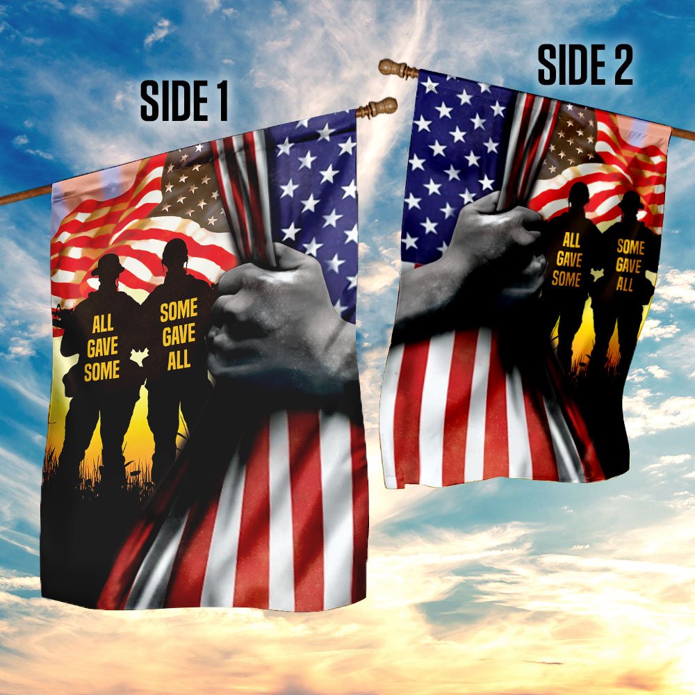 All flags are manufactured to American quality standards and custom-made to order. You will never be disappointed by the All Gave Some Some Gave All Veteran Flag.
