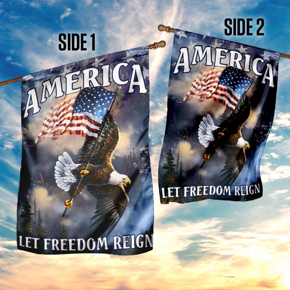 All flags are manufactured to American quality standards and custom-made to order. You will never be disappointed by the America Let Freedom Reign Flag.