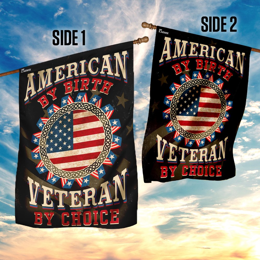 All flags are manufactured to American quality standards and custom-made to order. You will never be disappointed by the American By Birth Veteran By Choice Flag.