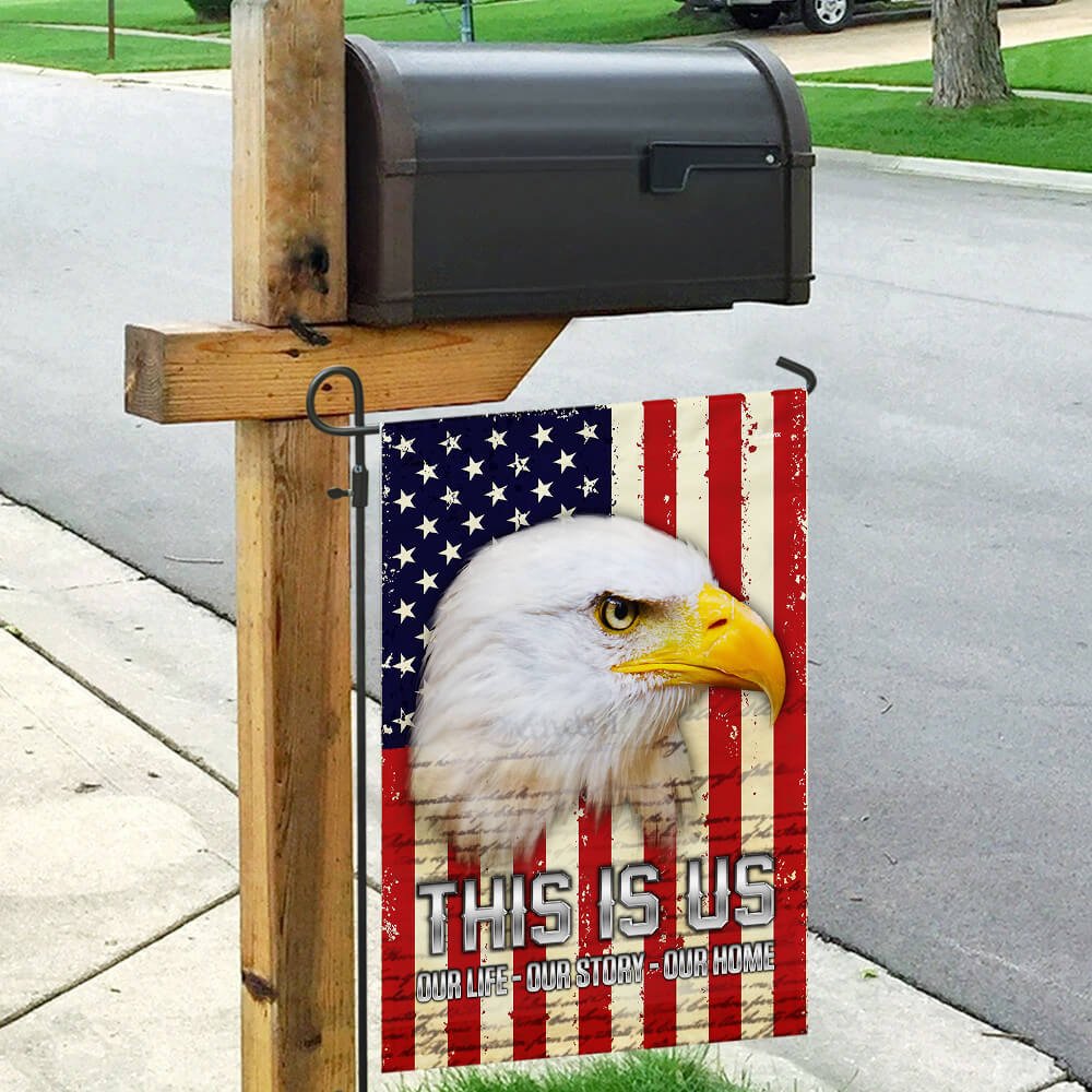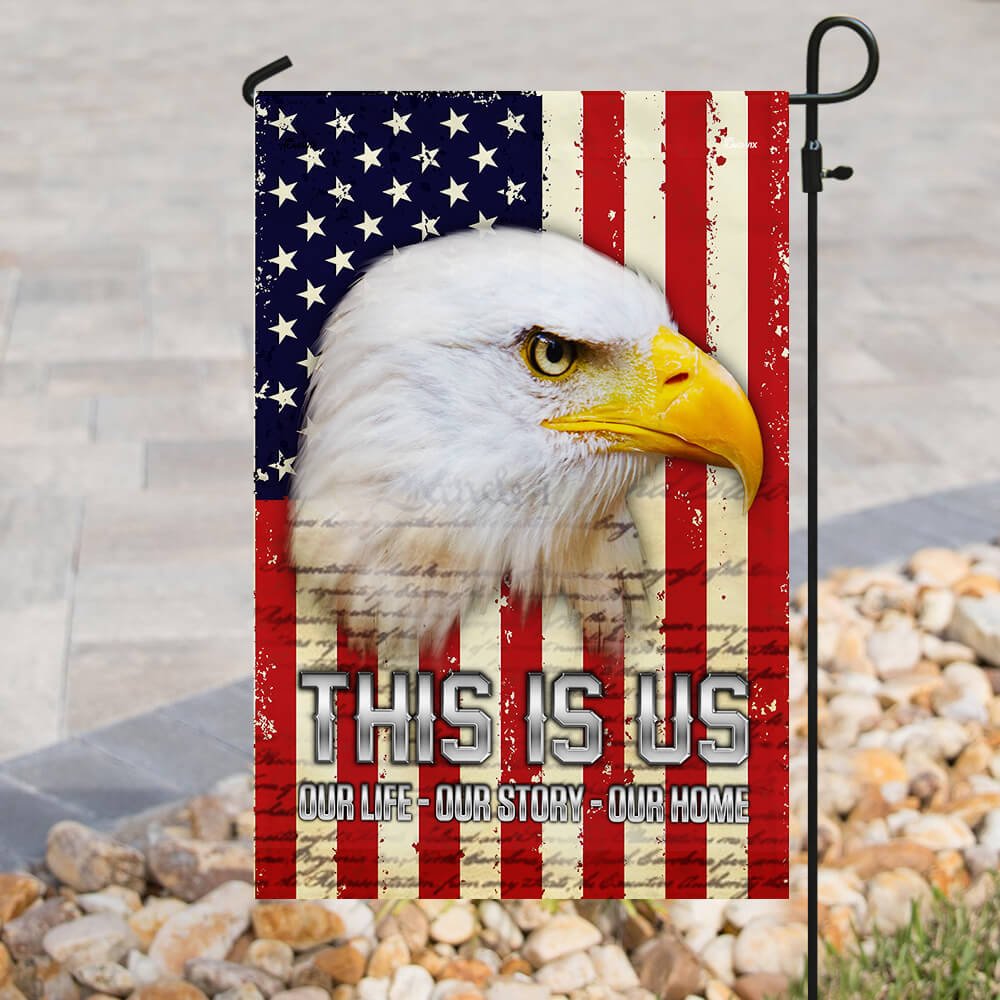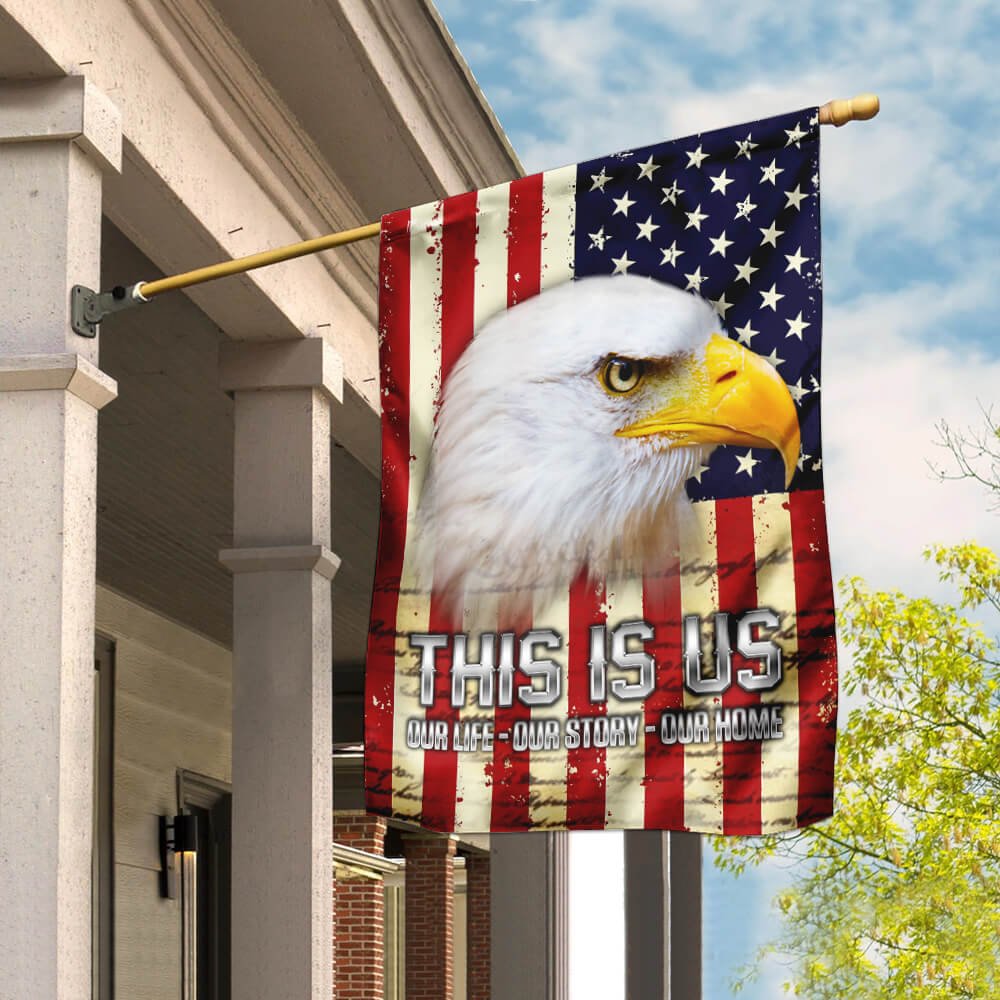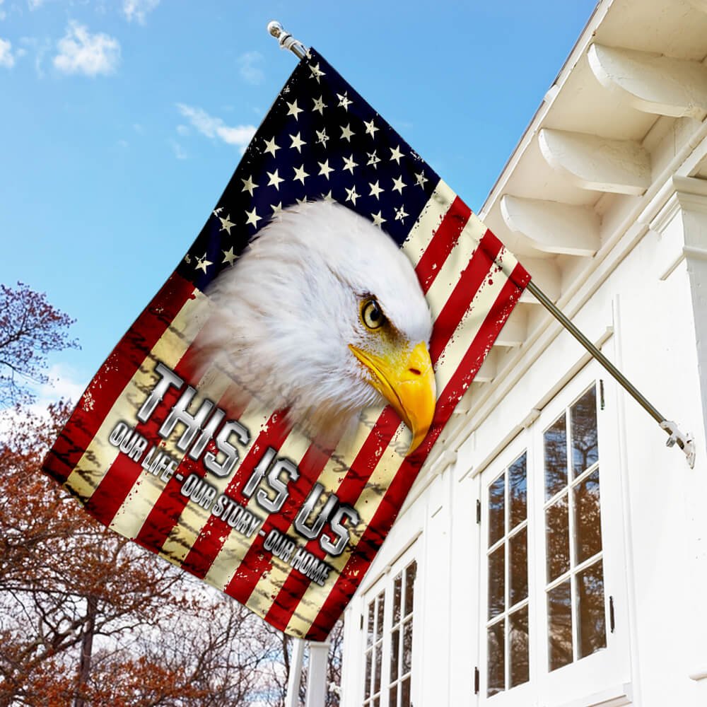 All flags are manufactured to American quality standards and custom-made to order. You will never be disappointed by the American Eagle Our Story Flag.