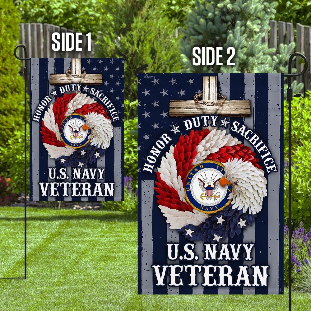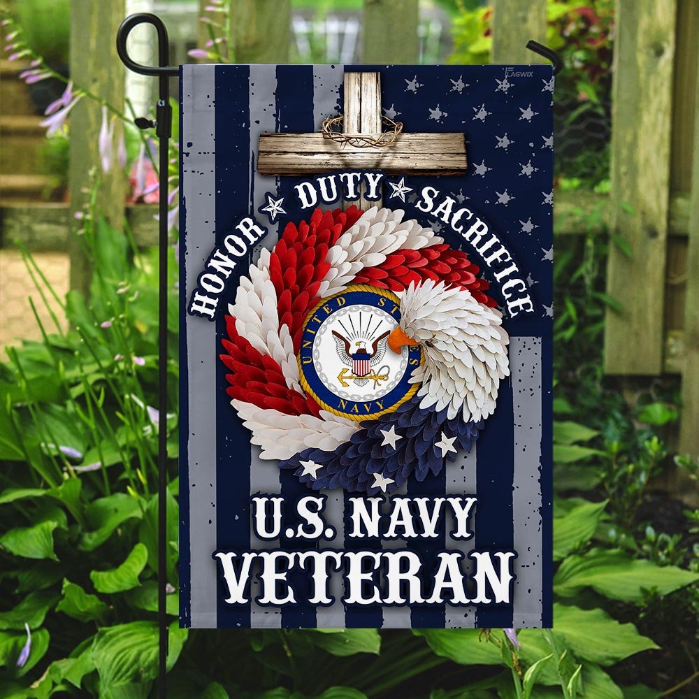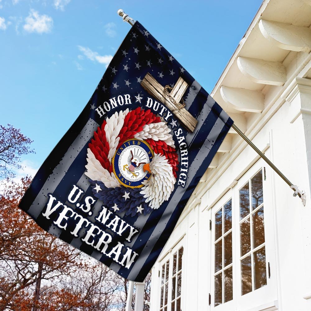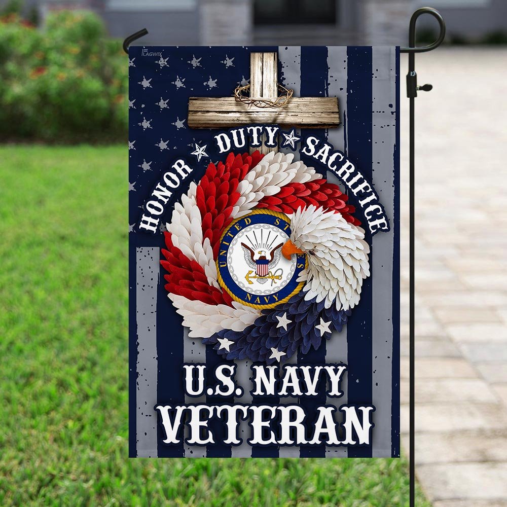 All flags are manufactured to American quality standards and custom-made to order. You will never be disappointed by the American Eagle Wreath With U.S Navy Veteran Flag.